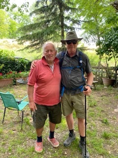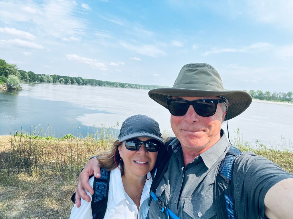 In order to get back on the Via Francigena we walked the Camino di San Colombo, the 6th century Irish monk we talked about yesterday. The path took us along the river Ambro, a beautiful walk under the trees, to its juncture with the Po river, that broad expanse of grey flowing south east atop northern Italy to the Adriatic. Danielo runs a ferry taxi service that will take you across the river and 3.7 km downstream. We made the reservation to meet him at 11:30 at a makeshift dock along the shore. How we found it is a mystery. The “ferry” was a 12 ft aluminum skiff but it ably carried us downstream and across the river to Danielo’s house where we were treated us to his PHD in Segeric lore.