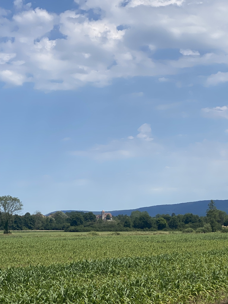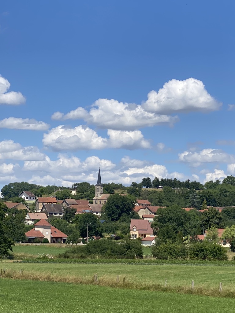 We are moving into the Jura mountains, with regular 300 m climbs and descents, walking along forest tracks in the shade of tall evergreens. While it is hot, the shade and cool breezes make for a pleasant stroll. We ran into Lois, our fellow traveler from Germany, who spent the night under the infinite stars, but needed to rest because his foot was bothering him. He is in his element so we are sure he will be ok. Even though we are in the middle of nowhere, we were able to land in a 4-star hotel with AC and a great restaurant, with one caveat: the restaurant is closed on Sunday. We will have to make up for it in Besancon which we will reach for a 2-day rest tomorrow.