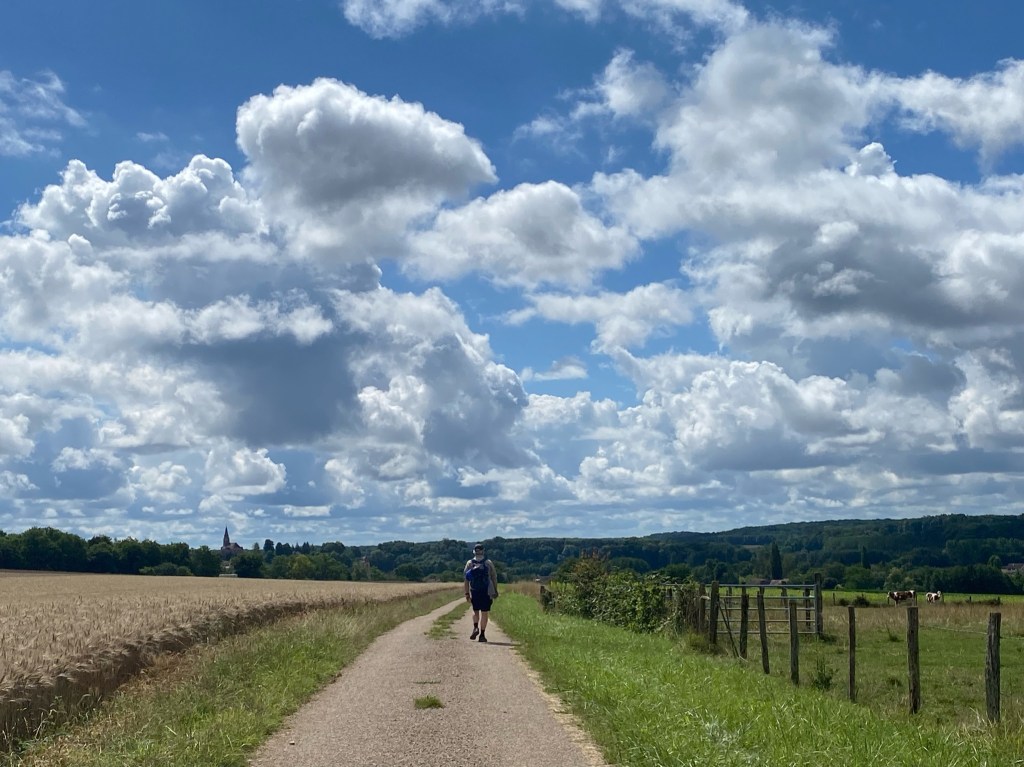 A wonderful walk along the Canal Entre Champagne and Bourgogne and around Lac de la Liez where we had lunch, a baguette and an orange under a weeping willow, but when the path took a turn into the wooded area along the banks of the river Saolon it became very muddy and covered with nettles and thorny bushes, so much so that in places the path was not visible. This slowed our pace down from our usual 22–24-minute mile to a 50 minute mile. We were happy to arrive at our Pilgirm’s B&B, flies and all, though we stayed clear of the shed with all the chainsaws.
