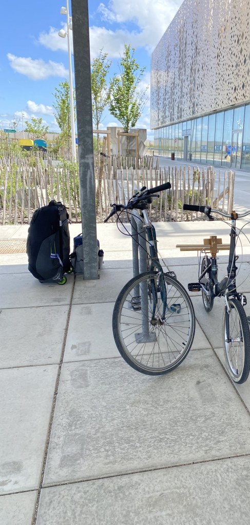 In Dover the ferry lines prohibit pedestrians but allow bicycle traffic. When confiding with John, the hotel manager, of our plight he produced 2 bicycles from his basement. Intrigued by our caper to load our luggage on the bikes, board the ferry, arrive in Calais, dump the bikes, he then engineered an elaborate platform on the back fenders of the bikes using bedframe parts and duct tape. The only problem was the bicycles no longer had seats. It worked, we arrived in Calais