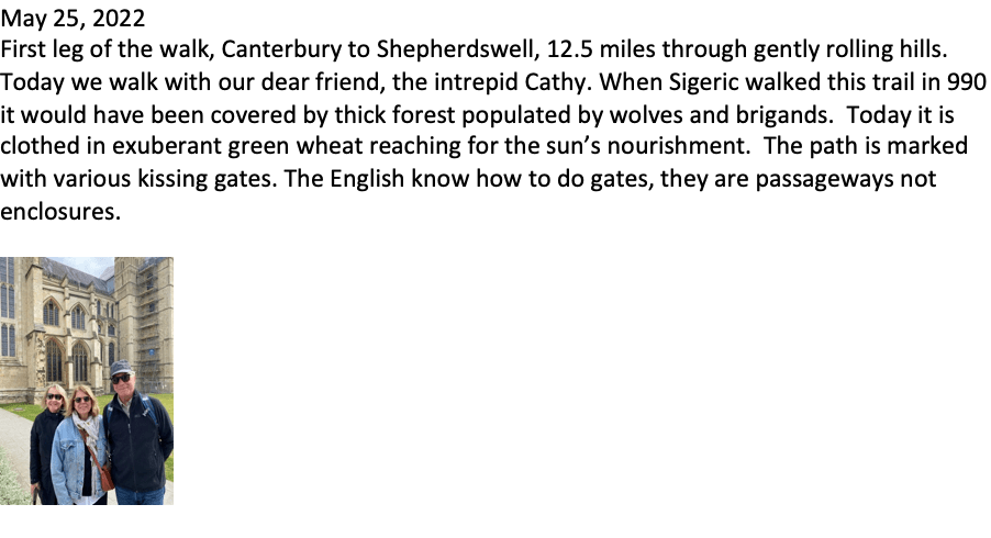 After 2 years planning, we are on our way. It is unexpectedly emotional to be addressed as “Pilgrims”. As we approached the counter to buy tickets to enter the Cathedral and to get the first stamp on our Via Francigena passport, the docent asked “Are you walking from Canterbury to Rome?” At that moment I felt induced into the community of wanderers along the Francigena, a subculture of thru-walkers, known and recognized along the way. “Pilgrims enter for free” he said as he stamped our passport, “Have an uplifting journey.”