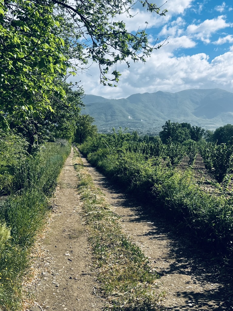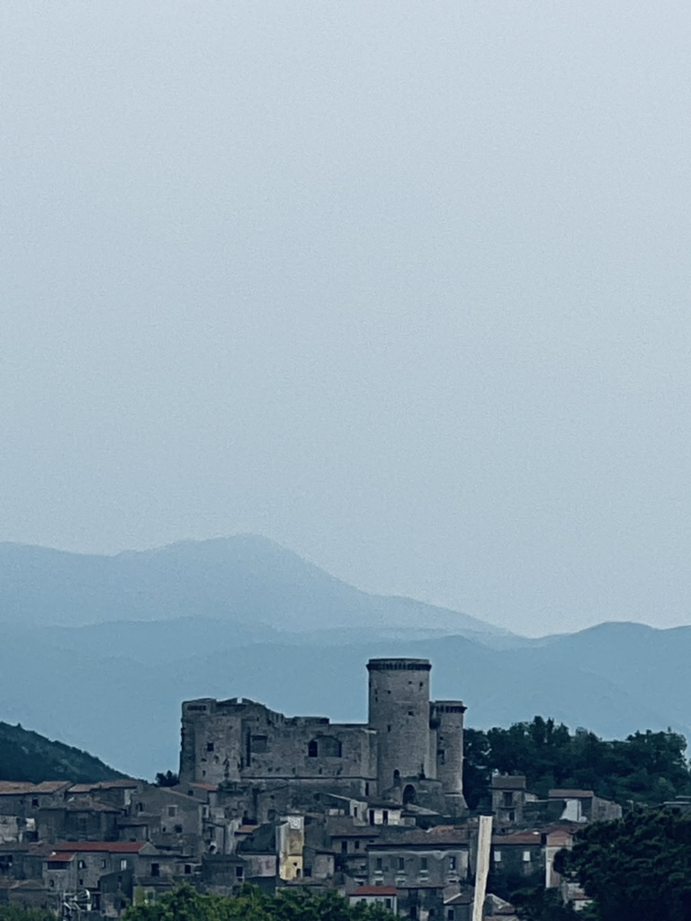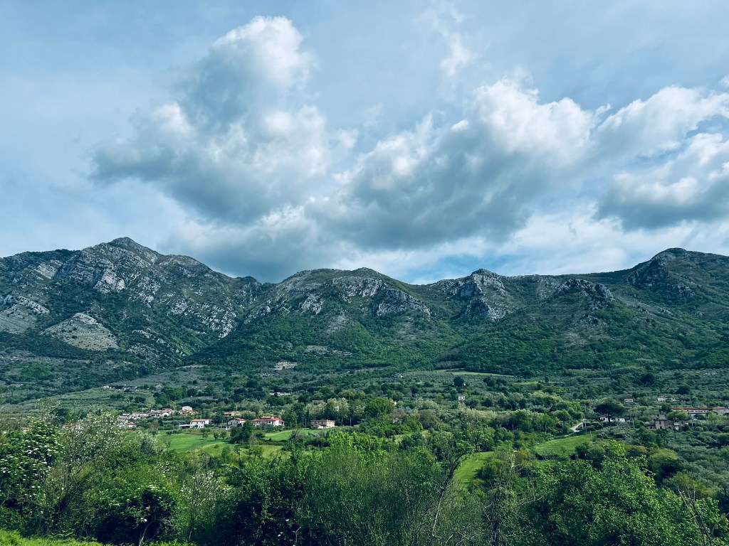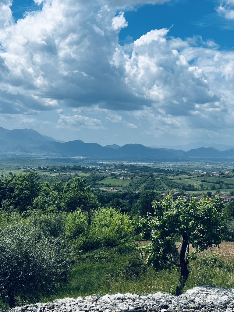 We swept down to the valley from the Irpinian hills toward the Matese and Vitulano mountains and the Apennines. We found rich farmland, olive groves, some vineyards and heard the grinding sound of tractors tilling the soil and the buzz of weed whackers clearing aggressive weeds. A valley teaming with life.