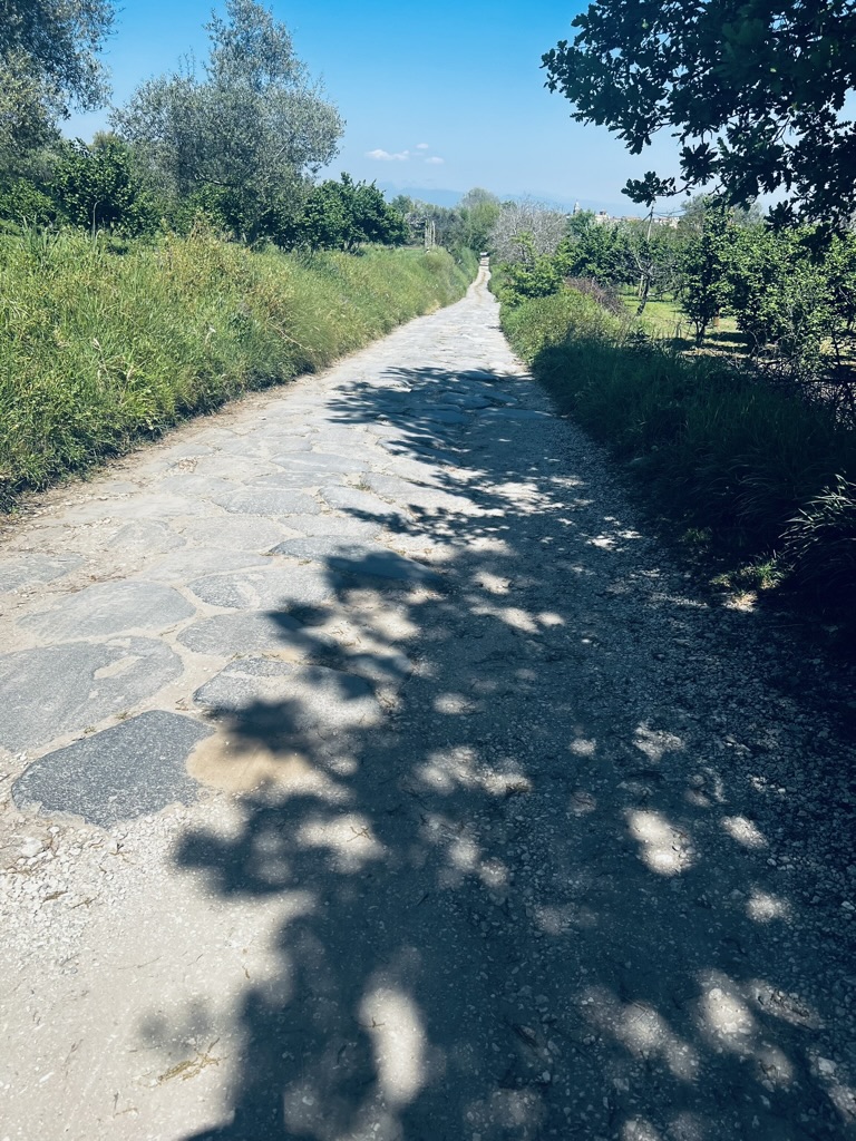 Walked by an old and unmarked church carved into a rock but of unknown origin or date. The iconography was unidentifiable. We paused for a while to imagine what it could have been concluding that it was most likely a church destroyed during WW2, but who knows it could have been an Etruscan temple infected by the Baroque. We are walking along the Via Appia, through old olive groves, where gnarly trees have survived hundreds of years, through earthquakes, plagues, famine, wars and human neglect but continue to produce a life-giving elixir for our benefit. Teano was a welcome relief even though it required a 300m climb, at the end of the day, up a deeply troughed escarpment. At Teano we enjoyed dinner at a restaurant that where patrons were out of Godfather central casting.