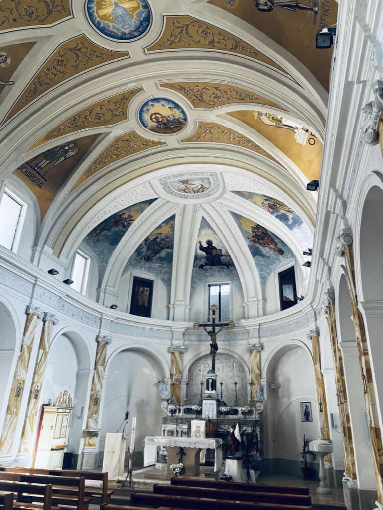 The heat is setting in earlier than ever, up in the 80s today, just in time for the first 30km trek of this walk. We started walking by the Garigliano River, and then made our way up the Aurunci mountains to Sessa Aurunca. This area was the site of some of the most ferocious fighting in WW2, Sessa itself and Teano, where we go tomorrow, were pulverized before the Germans were chased out. Nonetheless, the towns are full of life and you wouldn’t know they had come back from a pile of rubbish until you look at the pictures hanging in the café/bars that reveal a desolate landscape where nothing is standing. Great care was taken to restore the interior of the churches to their riotous Rococo pageantry, as though nothing happened. It was a tough day, but we had the best meal to date: a plate of spaghetti Lupini, the smallest vongole but by far the tastiest.