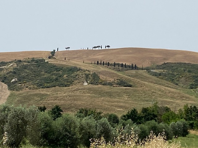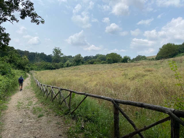 Our last day in the open fields as tomorrow we cross the Rome GRA and walk through the Rome suburbs and finally to Vatican City. The scenery looks amazingly like the one we swept through in Pas-de-Calais in France at the beginning of the walk. Fields of tall wheat, the pungent smell of cow pastures and hog farms, gently rolling hills and puffy clouds in the distance. No amount of fatigue can obscure the lightness of such walking.