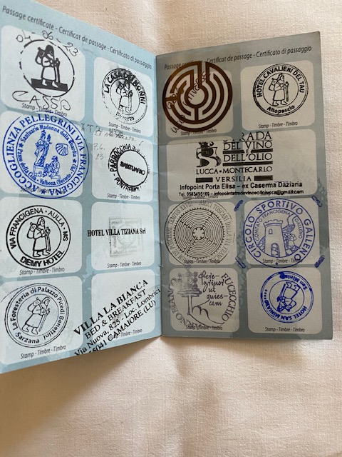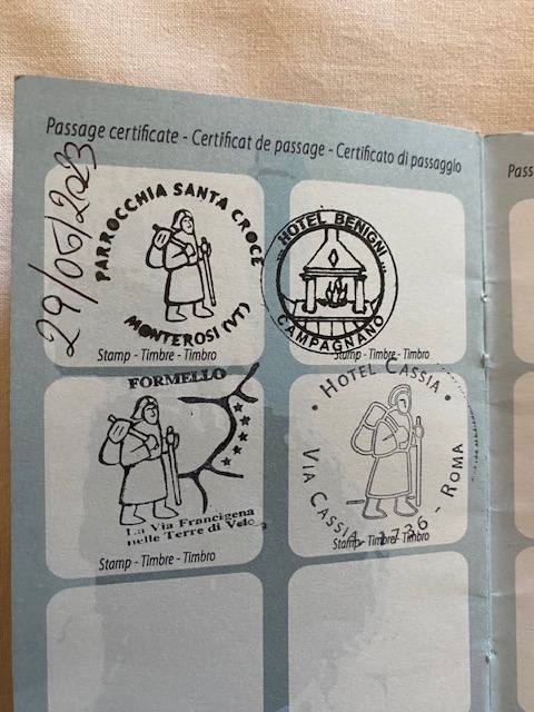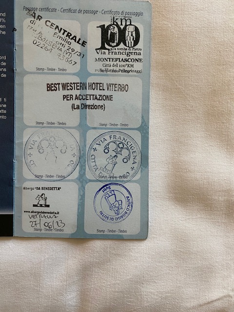 We left Montefiascone in early morning, getting our pilgrim passport stamped at the tourist office, which was open, where we were informed that Montefiascone marks 100 km from Rome. Walking 100 km just a short while ago would have seemed extreme, now it is just a 4 day journey. We march on.