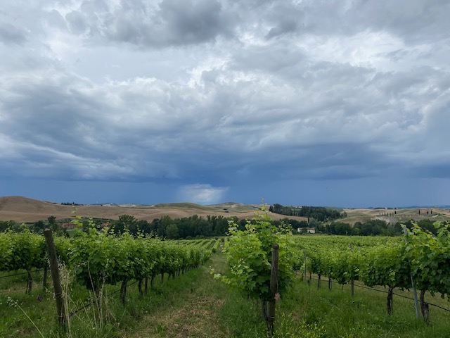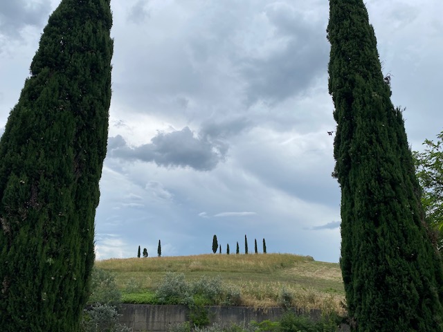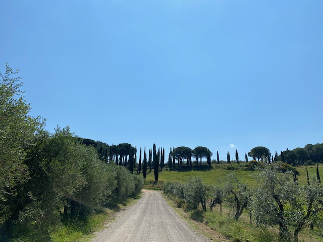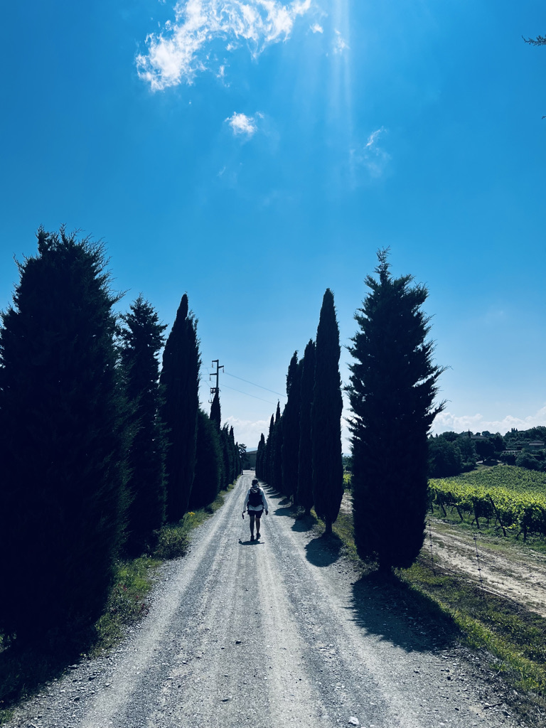All day we walked around in a renaissance landscape painting, replete with undulating paths lined with cypresses, Roman pines, vineyards and wheat fields. If serenity can manifest itself on the ground we walk, we can be said to have moved through the most serene and tranquil reality imaginable. Paula called it a caricature of itself, this simple but iconic landscape beauty, but not a cliche.