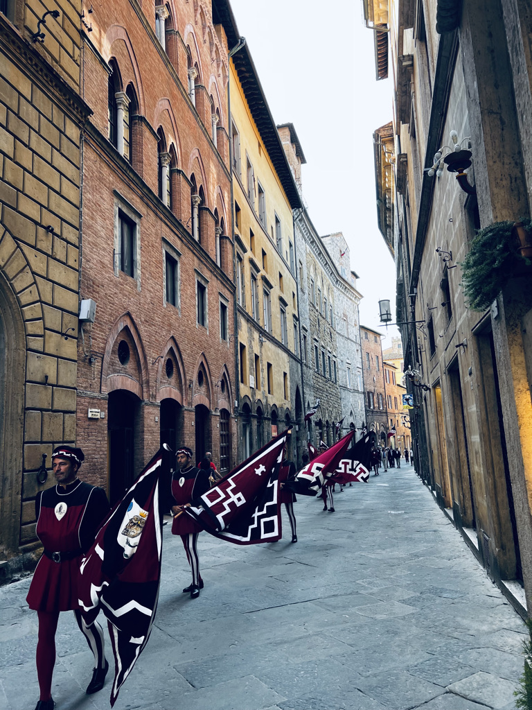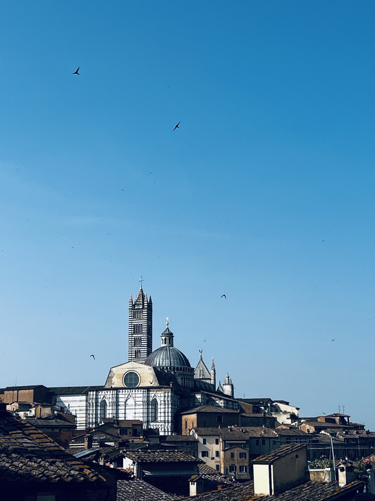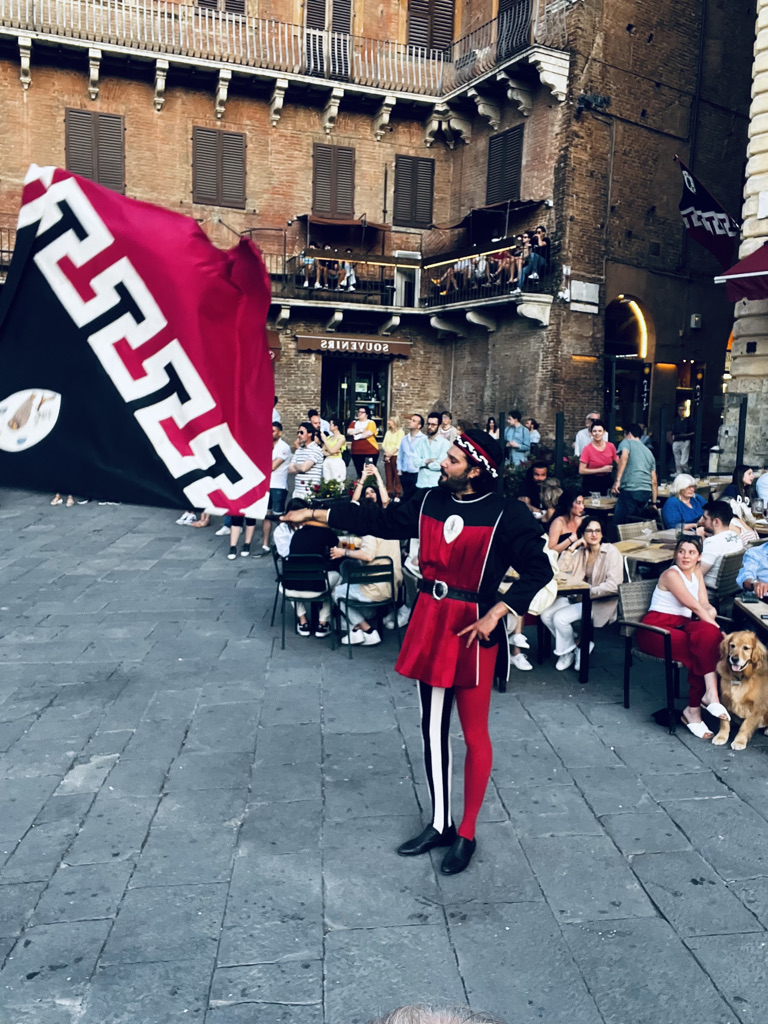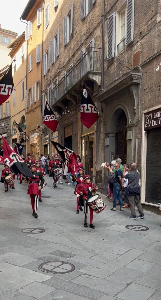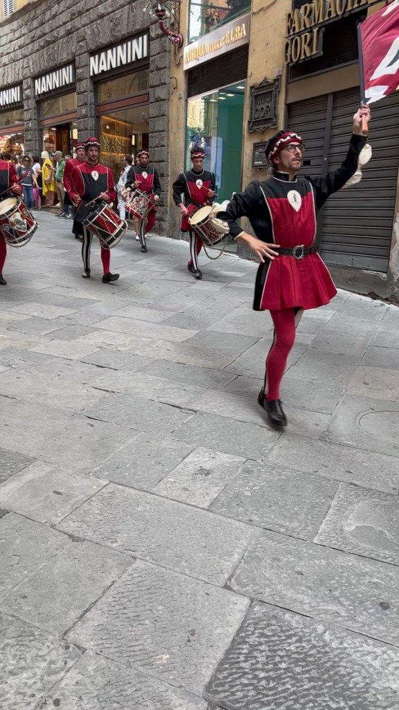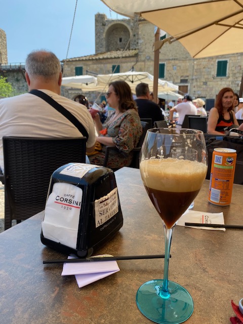 We stopped briefly in Montereggione for a Shacherrato (shaken iced coffee) and finally arrived in Siena at 6:30 during an anti-vax protest apparently convened because Dr Fauci is receiving an honorary degree from the University of Siena. The city, with its 1000 year old duomo, campo and tower, is so rich in history and art that we would have to spend at least a week to properly appreciate it. As it is, this is our first, and only, 2 night stay and we will do a lot of sitting and foot resting instead of touring. Our respite will be accompanied by trumpets and drumming in the streets of the Contrade practicing in preparation for the Palio July 2.