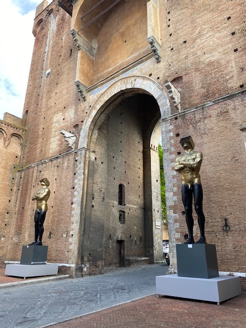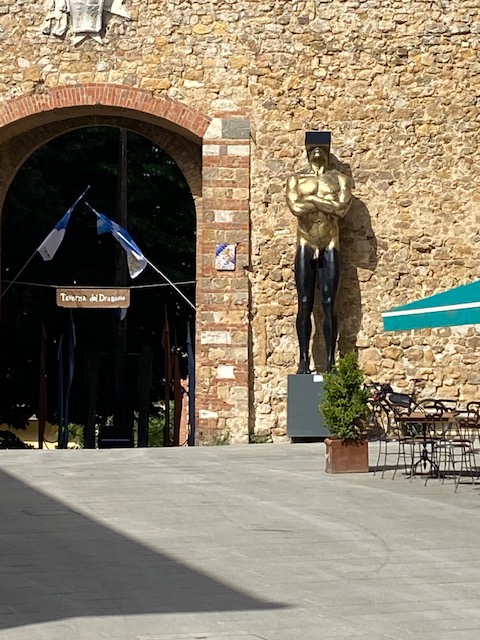 San Quirico, like many towns in wine regions, is well managed and provisioned. Lots of restaurants, Cafe/Bars, an information office open till late, Churches open at all hours, and enough wine tasting cantinas to quench the thirst of invading Huns. It also exhibited imposing sculpture by an artist we first noticed in Siena, Emanuel Giannelli, of a giant bronze figure searching the skies with what look like virtual reality lenses, in both cases place just outside the Roman Porta. The modern equivalent of a Roman Centurion.