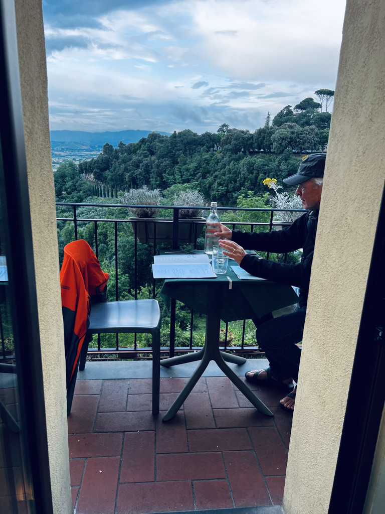 San Miniato the mediaeval hilltop town where we spent a restful night, is perched on a cliff with commanding views of the valley below. It is quite a lively town, with half a dozen upscale trattorias and bars with ultra modern decors. Let’s Face the Music and Dance wafted out the doors of one where, as we passed by the kitchen, we glimpsed the chefs dancing with frying pans.