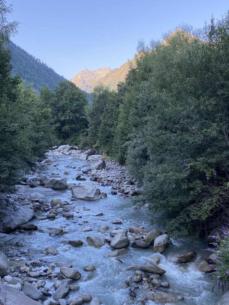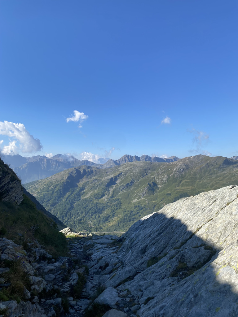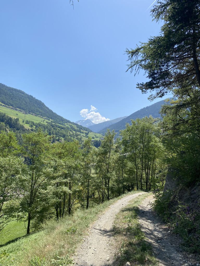 The path is kind, gently sloping down the Val D’Aosta through mostly pine forests with cool waters gurgling on the side but the heat sets in with an iron grip by 1 pm when we welcome the outskirts of Aosta to search for our hotel and a good lunch. We find both. Aosta is a charming little town alive with residents and vacationers strolling along its mediaeval streets or people watching, sitting at its many bars and cafes while sipping Aperol Spritzers. The ”passeggiata” (evening stroll) rules after 6 pm. Aosta also boasts some remarkable Roman ruins that would be world renown in any other country, including the well-preserved 1st Century Arch of Augustus at its entrance. The Cathedral, mangled by successive rulers of the Val D’Aosta eager to imprint their grandiosity for eternity, sits on a magical 4th century crypt that reminded me of the Canterbury Cathedral crypt, though the latter was built 700 years later. Our 2 night rest was restorative, especially on the heels of our emotional crossing of the GSB pass.