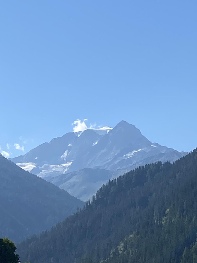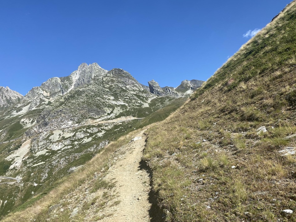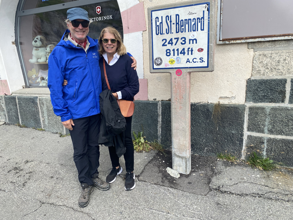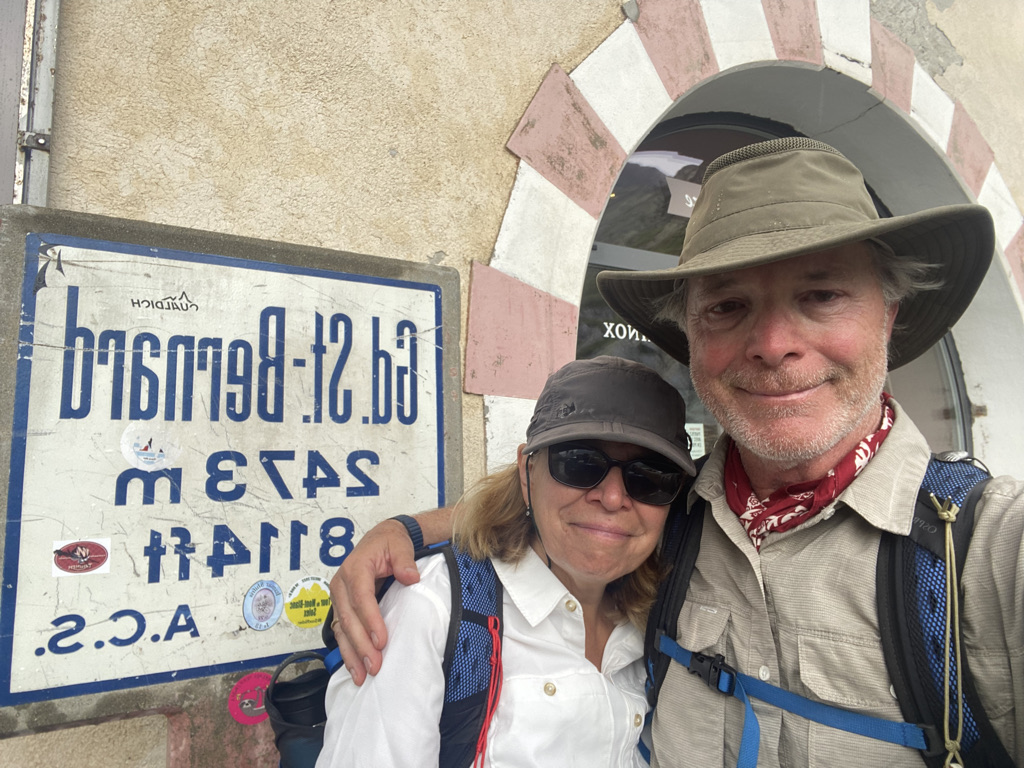 We now know what a “moderate but steady” climb means: relentless. We walk uphill until we finally reach a crest just to find more uphill and another crest. 5 hours of it, including water breaks, every half hour, lunch and time to take pictures, all under a cloudless sky. The scenery is breathtaking. We climbed to 6000 ft then back down to 5300ft. We are staying at one of just a couple of hotels in Bourg St Pierre. Everyone is wearing hiking outfits, even the couple in the Mazerati SUV; we met only one young couple on the trail, and they looked like day hikers, so we are puzzled about where everyone is hiking. Tomorrow, we climb to the Great St Bernard Pass.