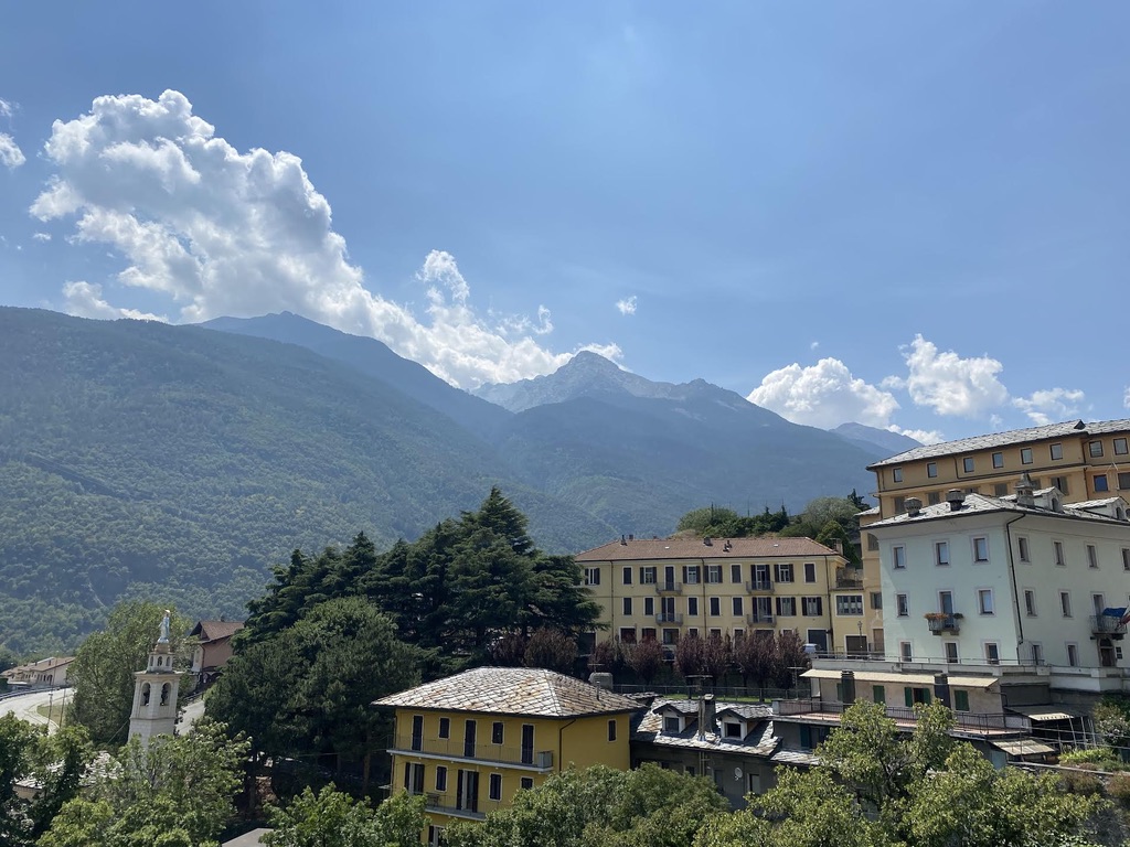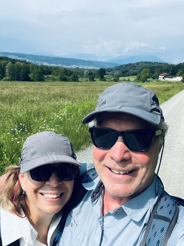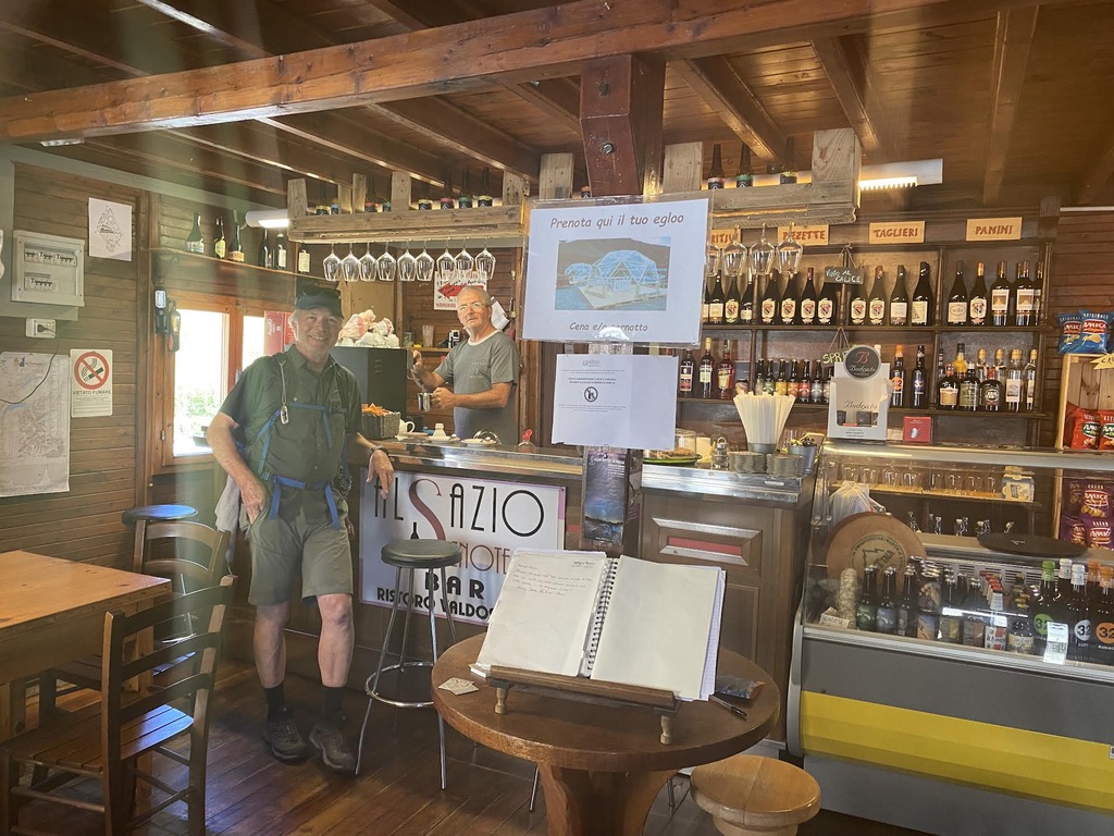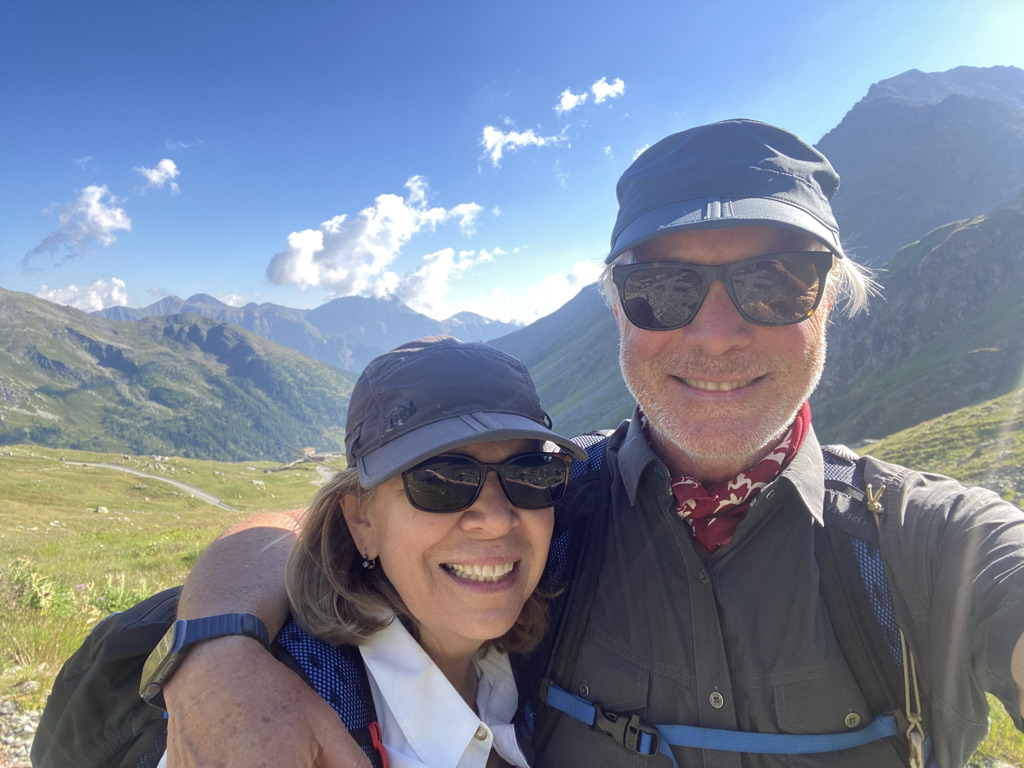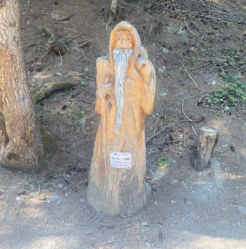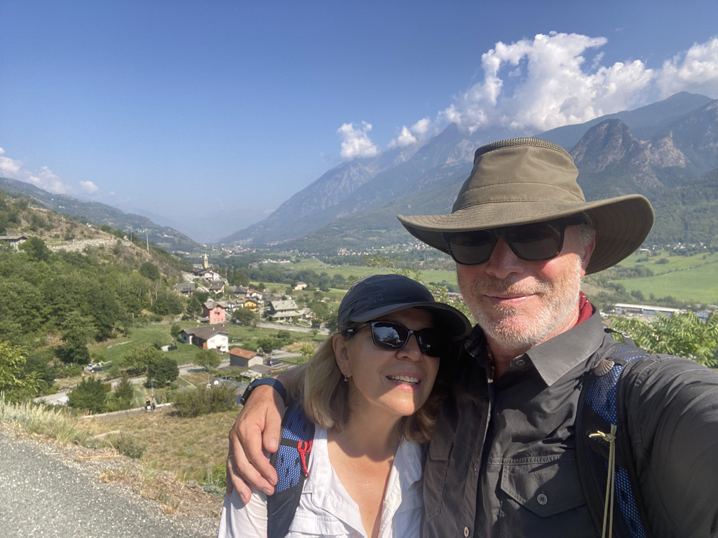 One of the most beautiful walks of the whole trip, down mostly gently sloping, pine covered trails through the Val D’Aosta. We left the pass early in the morning after saying goodbye to Rolf and Regula who climbed up from Martigny for their vacation. They are part of the global community of hikers we encountered on the Via, eager to share all sorts of helpful tips about hiking (use polls), eating (not before 10 am), GPS (MapOut-which is fantastic and we started using right away-AppStore $4.99). We also engaged in a wide ranging political discussion about the hot issues in Swiss politics that sounded eerily familiar: pension deficits, Ukraine, climate change, wokeness. A quarter of a km into Italy, on an almost vertical incline, we found a café/bar on the side of the trail where we enjoyed our first good cappuccino in 2 months. Fountains, benches, restaurants and cafes are widely available along the trail which is well marked and maintained. Good to be in Italy!