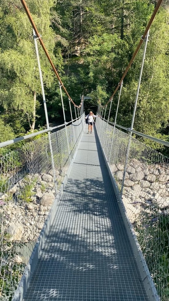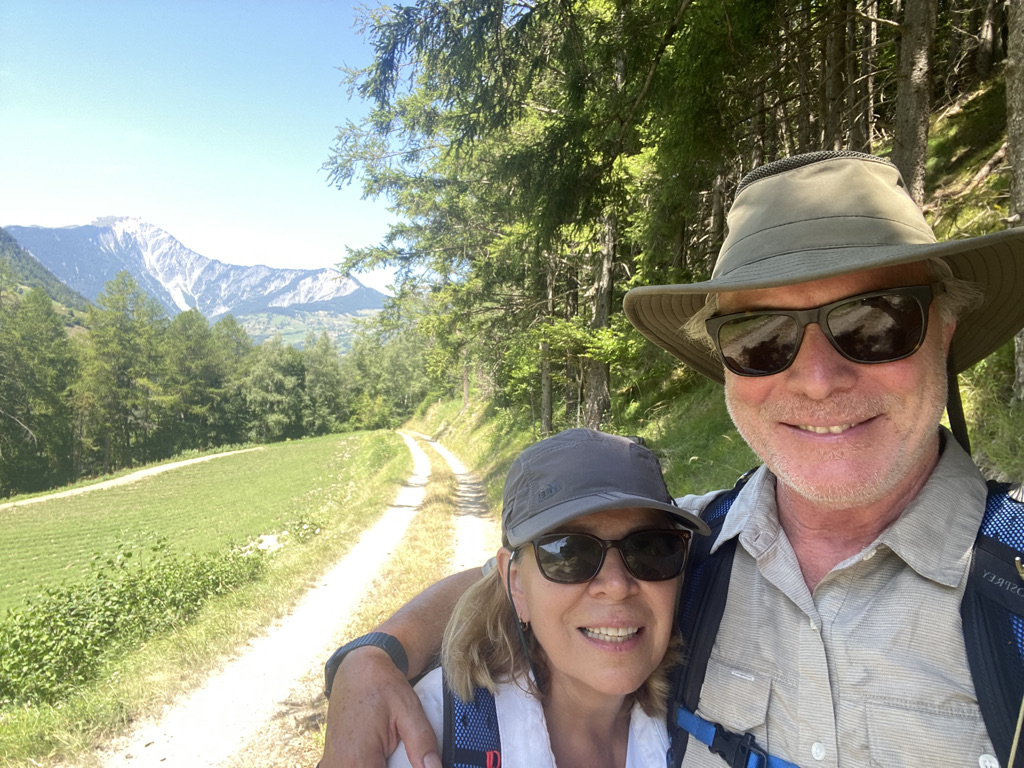The Alps are beautiful. One stunning panorama after the other. Our first 3000 ft climb was more routine than we expected. We had to take the San Bernard Express train for a 4 km stretch that had been wiped out by recent storms, so it was closed, but the ascent through pine forests and open fields of wildflowers was “the hills are alive” material that included a walk across the Dranse River gorge on a “swinging” bridge.
