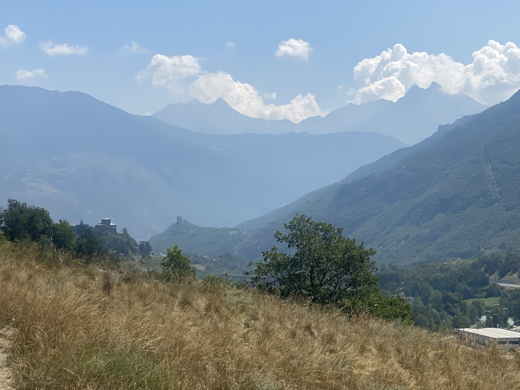 Walking in 90-degree heat is crushing, especially when, as we have over the past 2 days, the path meanders up and down mountain ridges in the Val D’Aosta. 1500 ft up, 1500 ft down, 2000 ft up and back down again. Drenched in sweat we seek the shade of a lonely tree to cool down, even for only a minute or two, gulp water and set off again. The weather is unusual for this area, so the hotels are not equipped with AC or fans. But we remain in high spirits for some reason.